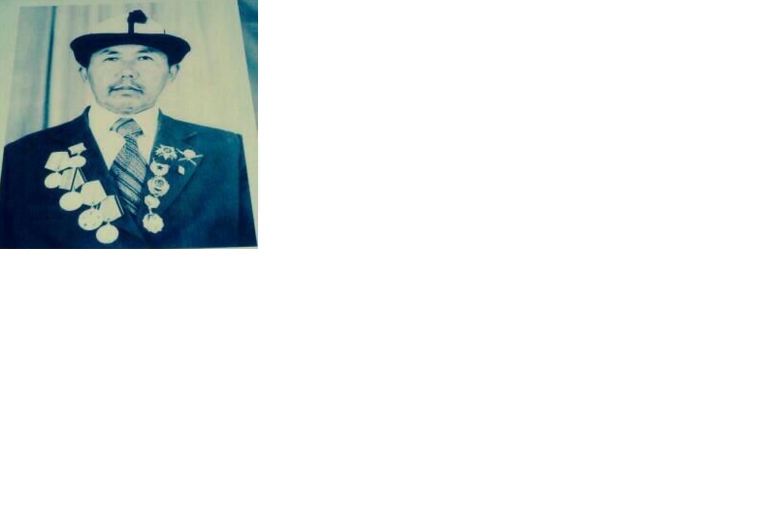 Был призван в красную армию в 1941 году, в Кировском районе Таласской области Киргизской ССР. Был дважды ранен, дошел до Берлина. Демобилизован в 1945 году. Вернулся в родное село Суулу-Маймак. Жил, трудился, стал отцом моей мамы в 1949 году. Скончался в 1993 г. Помним, любим, гордимся!
