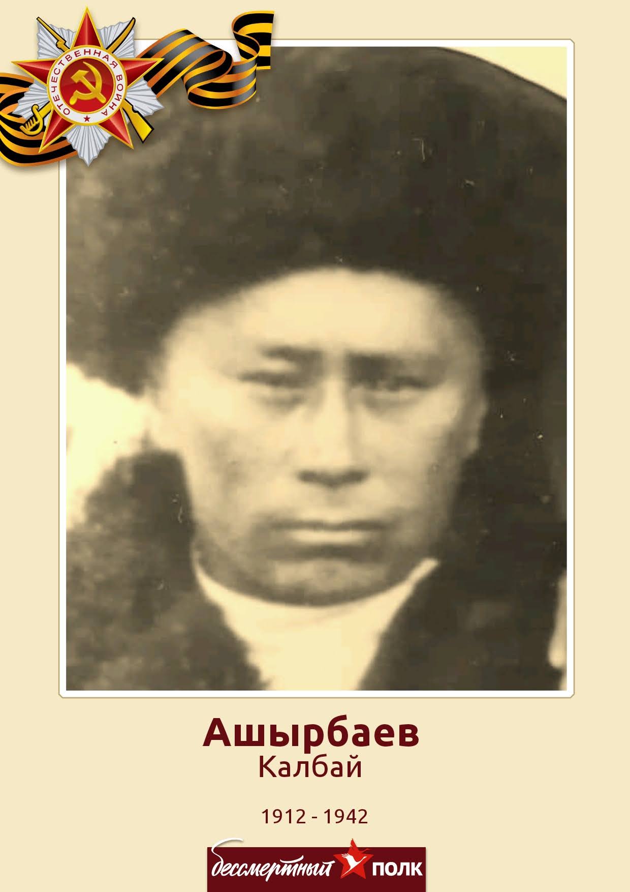 Ашырбаев Калбай Жумгал районуна караштуу Көл Арык сельсоветинде согуш жылдарына чейин төрага кызматын аркалаган. Согуш башталган жылдары бул аймакка айтылуу Балбан Каба уулу Кожомкул төрага болот, Ашырбаев Калбай анын катчысы болуп иштеген. 1942-жылдын 24.06 аскерге чакыруу алып, Кызыл Армиянын катарына жоокер болуп аттанат. Ушул эле жылы 1942-ж. 17-де...