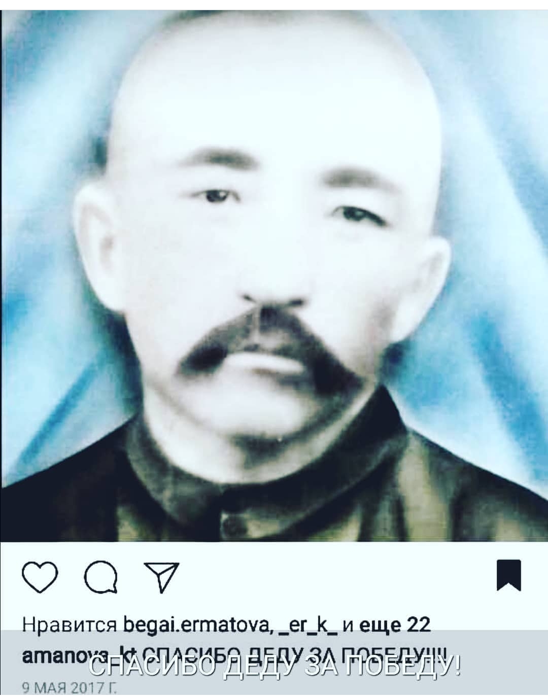 Мой дедушка Сасыкулов Курманкул в 18 лет ушёл служить на фронт, в августе 1941года. Он был снайпером, участвовал во многих боевых действиях, получил множество наград . Воевал до победного, вернулся с победой и пулевым ранением в руку. Спасибо нашим ветераном ВОВ, за отвагу, мужество и мирное небо над головой. Мы помним и гордимся!