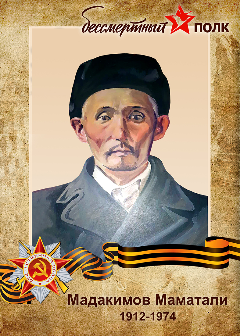 Мадакимов Маматали (1912 - 12.04.1974 гг.) Мой дед - Мадакимов Маматали (в некоторых документах - Маматолий) родился в 1912 году (в некоторых документах - 1899 или 1904 годы) в с.Гежиге Алайского района Ошской области Киргизской ССР, откуда в марте 1942 года был призван на службу в Красную армию СССР. Таким образом, красноармеец М.Мадакимов стал сапёром ...