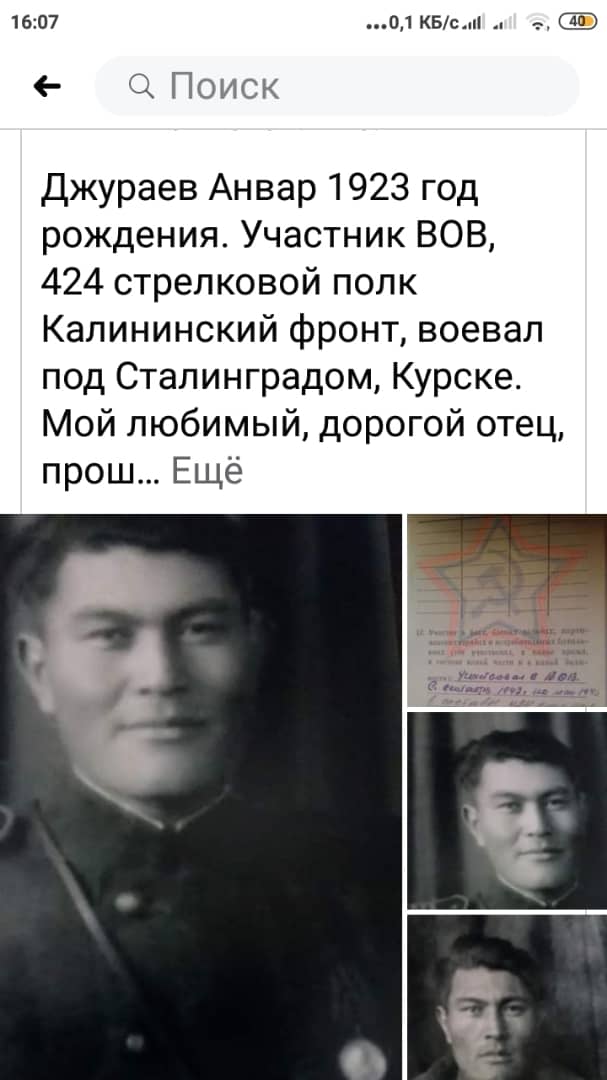 Джураев Анвар родился 1923 году в семье служащего. Отец Токторов Джоро был акимом, репрессирован 1937 года и расстрелян. 1942 году добровольно ушёл на фронт и был на войне до 1945 года и служил в Армию до 1948 года. Воевал под Сталинградом и Курском. Получил тяжёлые ранения в голову и с переломом правой руке Во время лечения в госпитале нашёл свою первую люб...