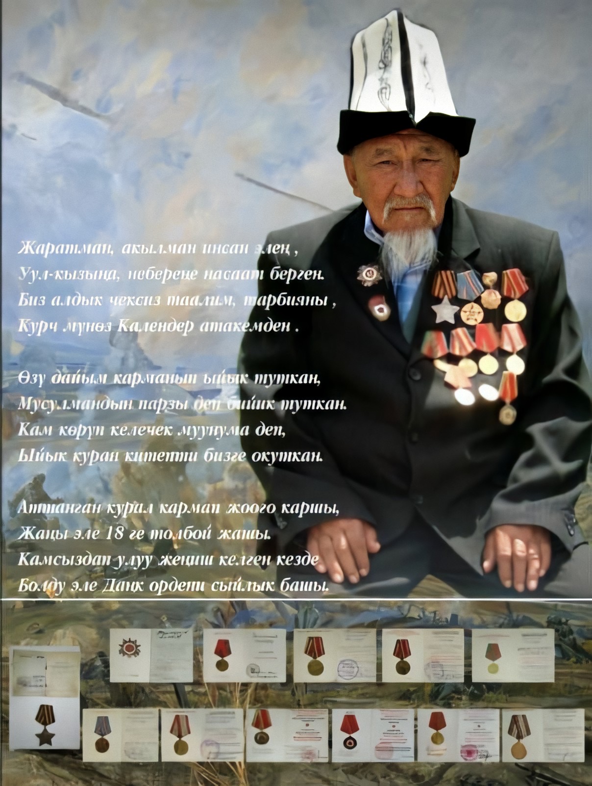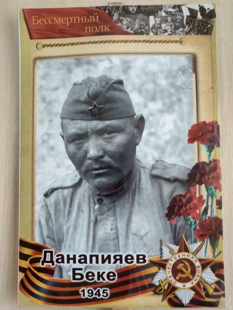 Данапияев Беке, родился в с. Дархан Джеты-Огузского района, в 1941 году был призван в ряды Советской армии и сразу ушел на фронт. Прошел всю войну рядовым пехоты, погиб в мае 1945 года при ожесточенных боях в самом Берлине, не дожив до победы несколько дней. Это последняя фотография дедушки, которую он прислал с фронта жене и детям.