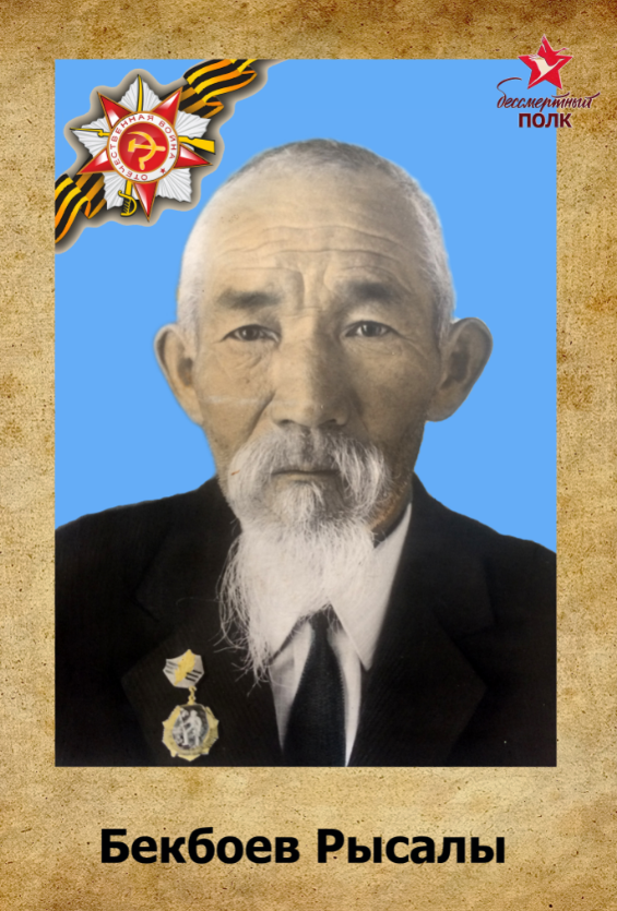 БЕКБОЕВ РЫСАЛЫ 1904-жылы Жумгал районунун Чаек айылынды туулган. 1941- жылы Улуу-Ата Мекендик согушка чакырылган. Ленинград алдындагы согушка катышкан. 1943-жылы жарадар болуп согуштан кайтып келген. Бир нече орден, медальдар менен сыйланган. 1978-жылы курман болгон. ЭСТЕЙБИЗ, СЫЙМЫКТАНАБЫЗ!!! Я ПОМНЮ, Я ГОРЖУСЬ!!! 75 ЛЕТ ПОБЕДЫ!!! БЕССМЕРТНЫЙ ПО...